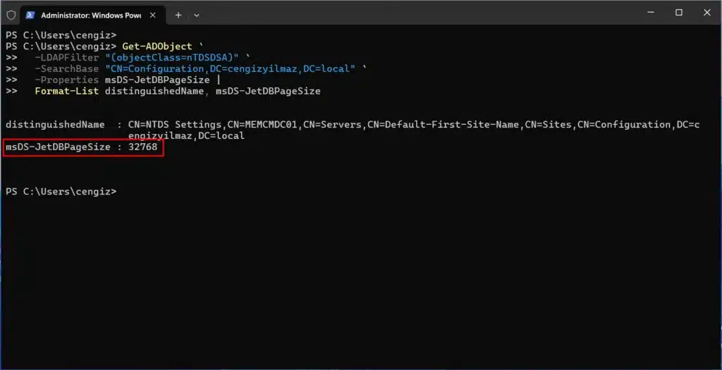 >> Format-List distinguishedName, msDS-JetDBPageSize