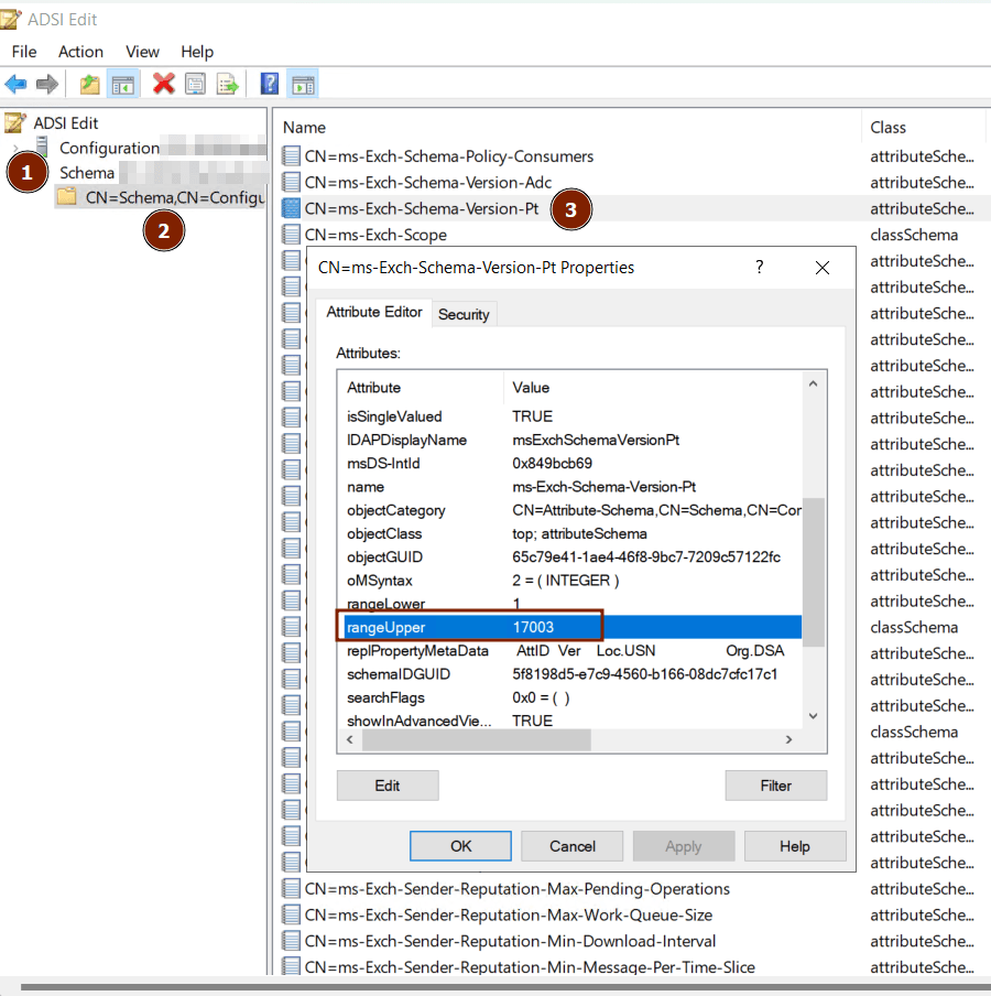 CN=ms-Exch-Schema-Version-Ptobjesini bulun. - Properties sekmesinde