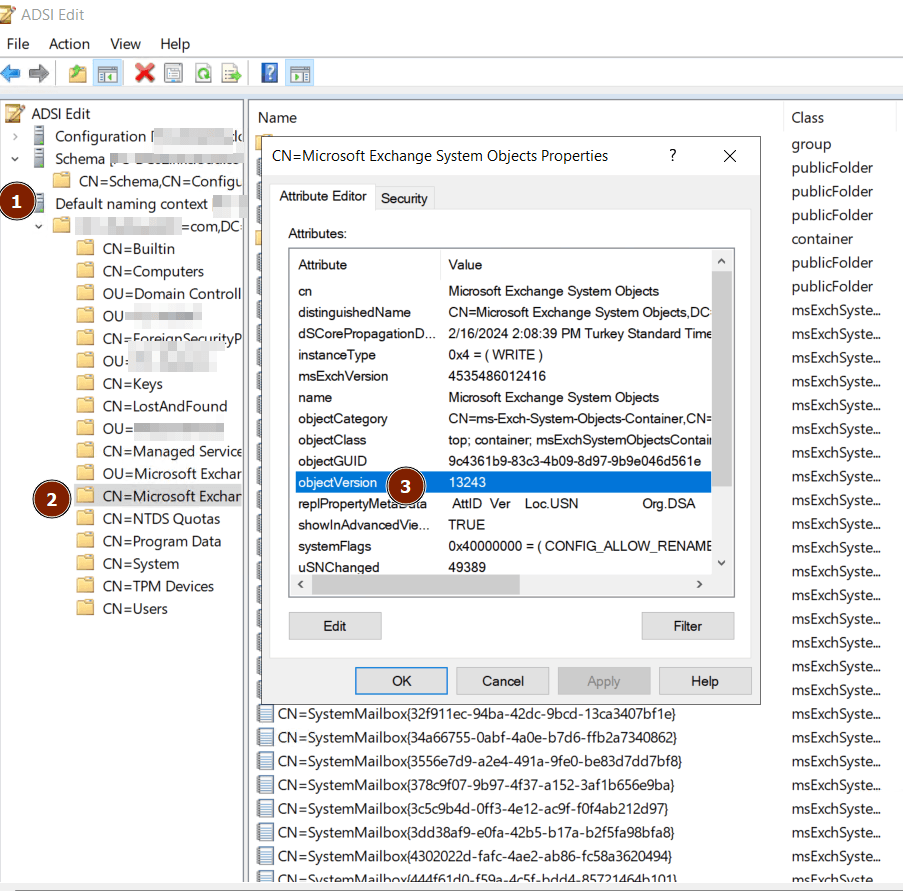 - objectVersion (Default): Microsoft Exchange System Objects konteynerindeki objectVersion.