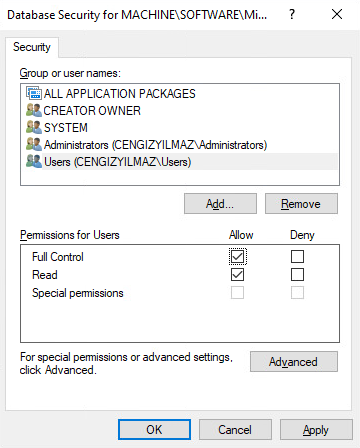 Select Registry ile aşağıda belirttiğim anahtara erişim izni vermemiz gerekmektedir.
