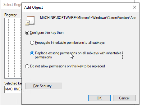 Yetki işlemini onayladıktan sonra “Add Object” penceresi üzerinden “Replace existing permissions on all subkeys with inheritable permissions” (Alt anahtarlarıdaki mevcut izni devrealınabilen izinlerle değiştir) seçeneğini işaretliyoruz ve OK butonu ile devam etmemiz gerekmektedir.