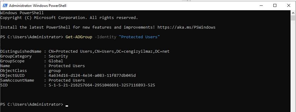 Get-ADGroup -Identity "Protected Users" | Add-ADGroupMember –Members "CN=Cengiz,CN=Users,DC=cengizyilmaz,DC=net"