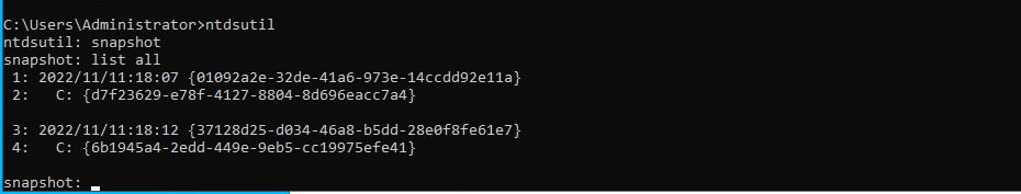 ntdsutil - Snapshot - list all komutlarını kullanıyoruz. list all komutu ile birlikte ortamımızda bulunan Snaphotların GUID değerini öğreniyoruz. Ben 2022/11/11 18:07 saatin anlınmış snapshot ile işlemlerimi gerçekleştireceğim. (1 numaralı Snapshot)