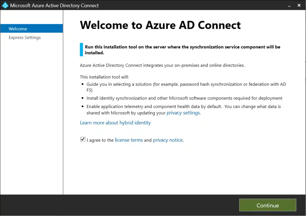 - İndirilen uygulamayı çalıştırın. “Welcome to Azure AD Connect” ekranı sizi karşılayacak, burada lisans sözleşmesini kabul edin ve ‘Continue‘ butonu ile devam edin.