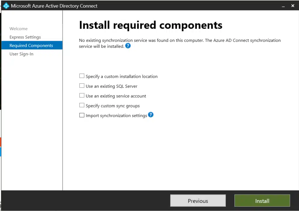 - ‘Install required components‘ ekranında aşağıdaki seçenekler sunulur: