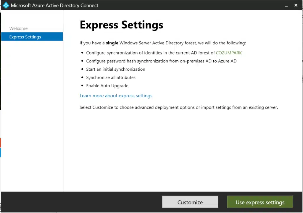 “Express Settings” ekranında, hızlı kurulum için ‘Express Settings‘ seçeneği veya daha detaylı bir yapılandırma için ‘Customize‘ seçeneğini tercih edebilirsiniz. Hybrid bir yapı kurmayı planlıyorsanız, ‘Customize‘ seçeneği ile devam edin.