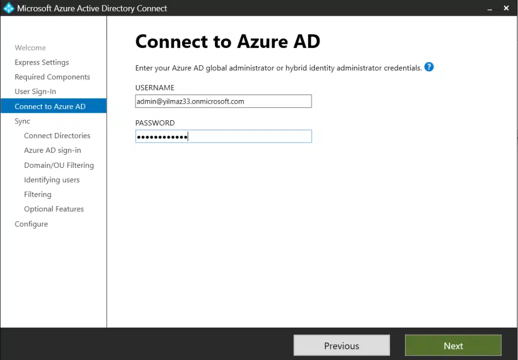 ‘Connect to Azure AD‘ ekranında, Azure AD’ye bağlanmak için global administrator yetkisine sahip bir kullanıcı bilgisi girilir.