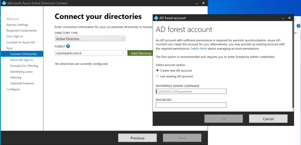 “Connect your directories” adlı yapılandırma ekranında, Active Directory için gereken yetkili kullanıcı bilgilerini girerek seçilen forest ile bağlantı kurulur. Kullanıcı bilgisi girmek için iki seçeneğiniz var: