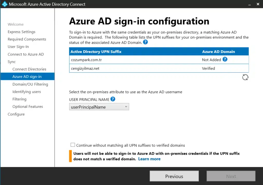 - Azure AD sign-in configuration bölümünde Azure AD Connect, Local Active Directory’de bulunan tüm User Principal Names (UPN’ler) listeler. Bu sayfada