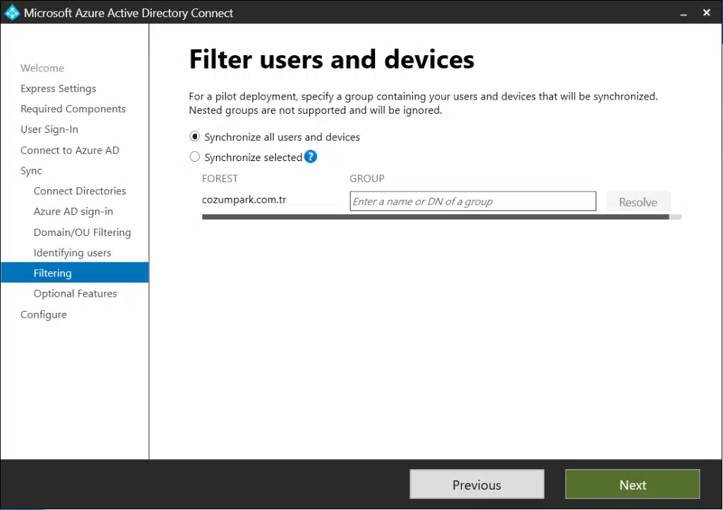 “Filter users and devices” penceresinde, belirli nesnelerin eşitlenmesine izin verebilirsiniz. Grup tabanlı bir eşitleme imkanı sağlar; on-premises Active Directory’de bir grup oluşturup bu gruba Azure AD ile eşitlenecek kullanıcı ve grupları ekleyebilirsiniz. İç içe geçmiş grup üyelerini ekleyemezsiniz.