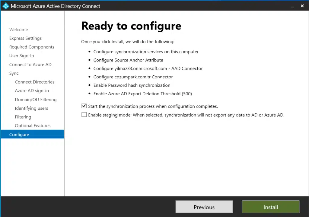 Tüm ayarlar yapıldıktan sonra, ‘Install‘ butonu ile kurulum ve yapılandırma işlemleri başlatılır. Kurulum tamamlandığında, Azure AD Connect’in başarıyla kurulduğuna dair bilgiler sunulur ve eşitleme işlemi başlatılır.