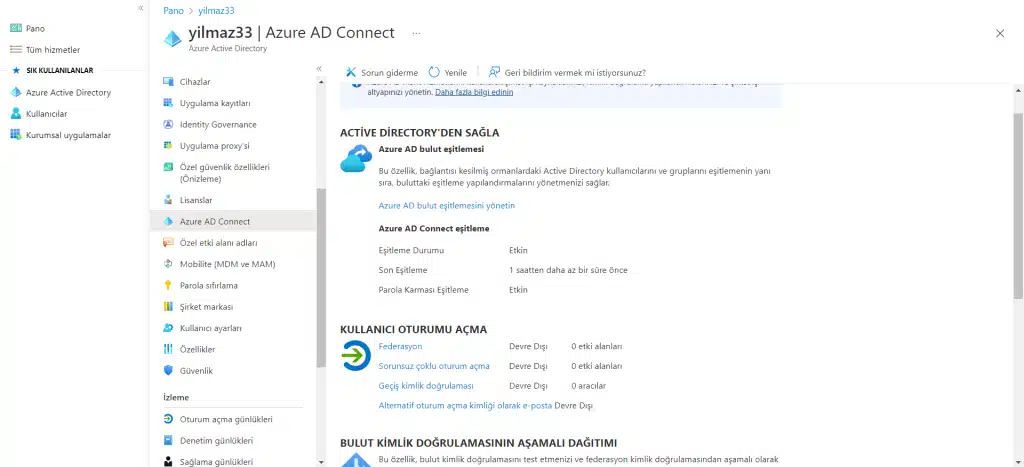 Şimdi, Azure Active Directory konsolunu açarak en son senkronizasyon bilgilerini gözden geçirebiliriz. Azure AD konsolunda, senkronizasyon işleminin aktif olup olmadığını kontrol edebiliriz.