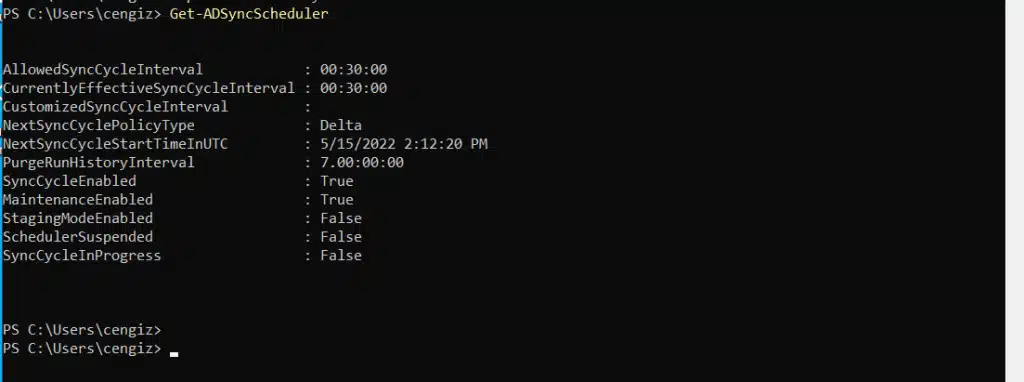 - Senkronizasyon sürecimizin mevcut yapılandırmasını ve zamanlamasını kontrol etmek için aşağıdaki PowerShell komutunu kullanabiliriz. Bu komut, senkronizasyon süresi ve bir sonraki senkronizasyonun başlama zamanını görüntüler: