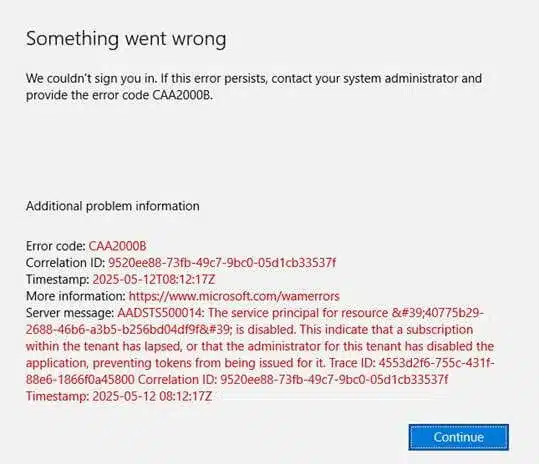 We couldn't sign you in. If this error persists, contact your system administrator and provide the error code CAA2000B.