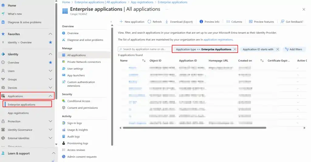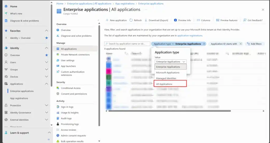 - Enterprise applications (Kurumsal Uygulamalar) sekmesine gidin