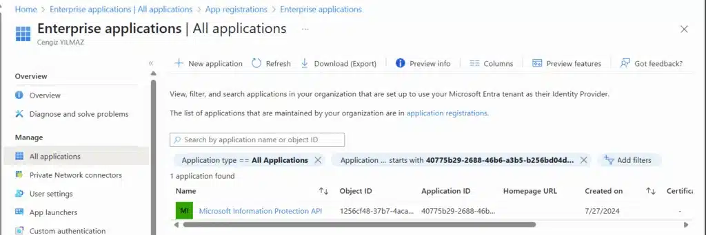 - Tüm uygulamaları görmek için filtreleri temizleyin. (Microsoft Information Protection (MIP) filtrelemeyi temizlemezseniz gözükmemektedir.)