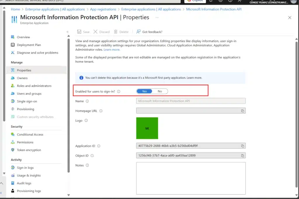 Oturum açma hatalarının kaynağı, Microsoft Information Protection (MIP) API uygulamasının kiracı ortamında devre dışı bırakılmış olmasıdır. Bu durumda, ilgili kurumsal uygulamanın yeniden etkinleştirilmesi yeterlidir. İlgili işlem hem Microsoft Entra portalı üzerinden hem de PowerShell aracılığıyla gerçekleştirilebilir.