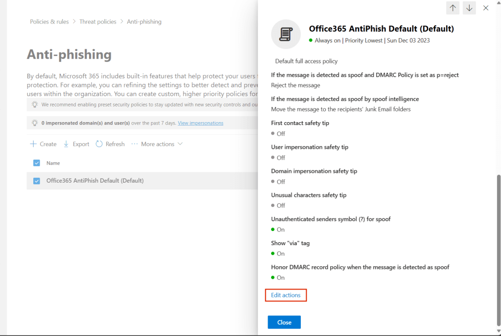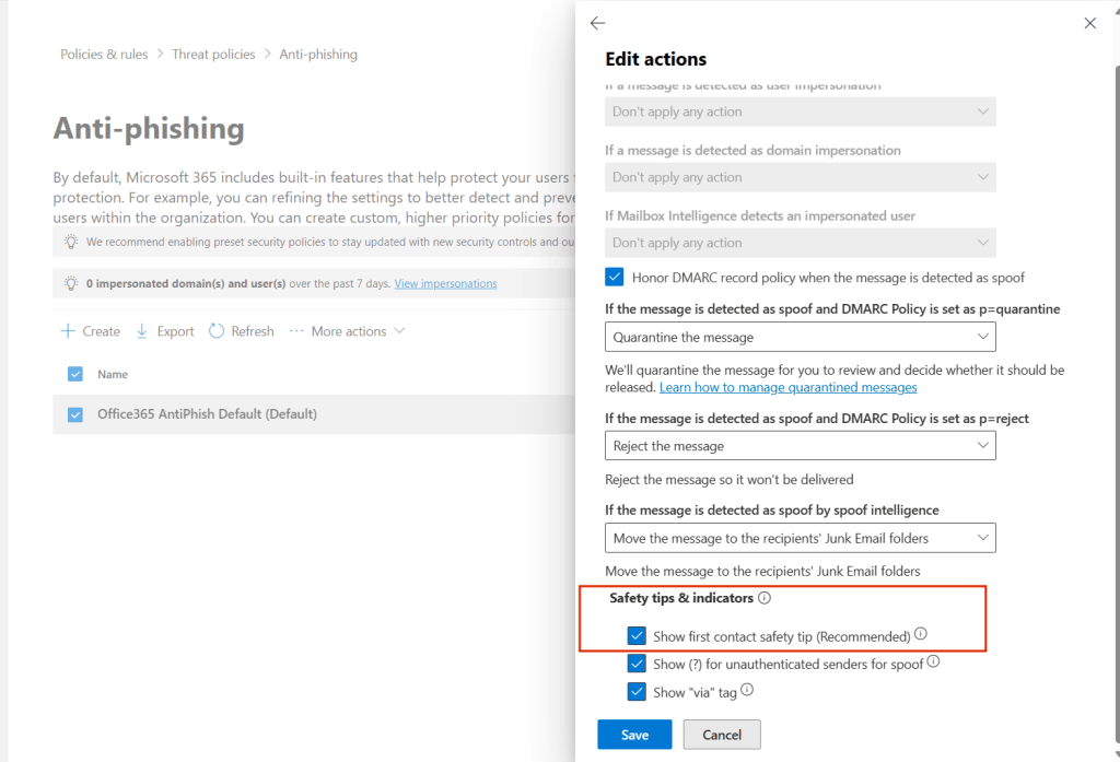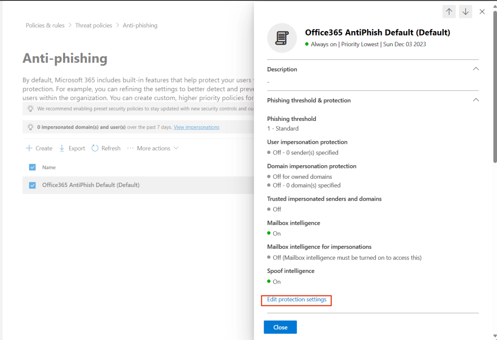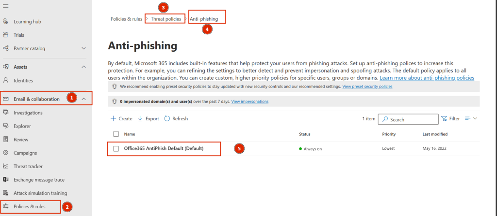 Daha sonra Microsoft 365 Security – Email & Collaboration – Policies & Rules – Threat Policies – Anti-Phishing (Under ‘Policies’)adımlarını takip etmemiz gerekmektedir.