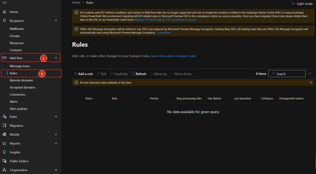 Exchange Online Admin – Mail Flow – Rules adımlarını takip ediyoruz.
