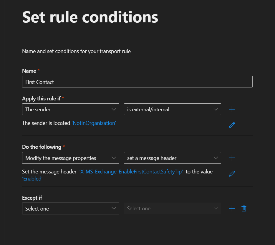Transport Rule etkinleştirme işlemi gerçekleştirebilirsiniz ve burada kullanıcı bazlı sınıflandırma sağlayabilirsiniz. Transport Rule oluştururken First Contact Safety Tip X-MS-Exchange-EnableFirstContactSafetyTip x-header bölümünü kullanmaktadır.