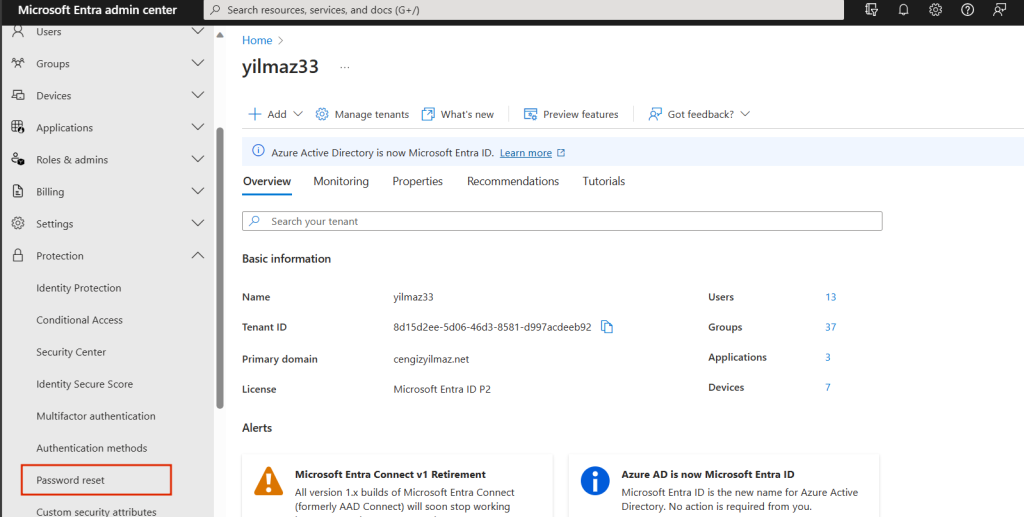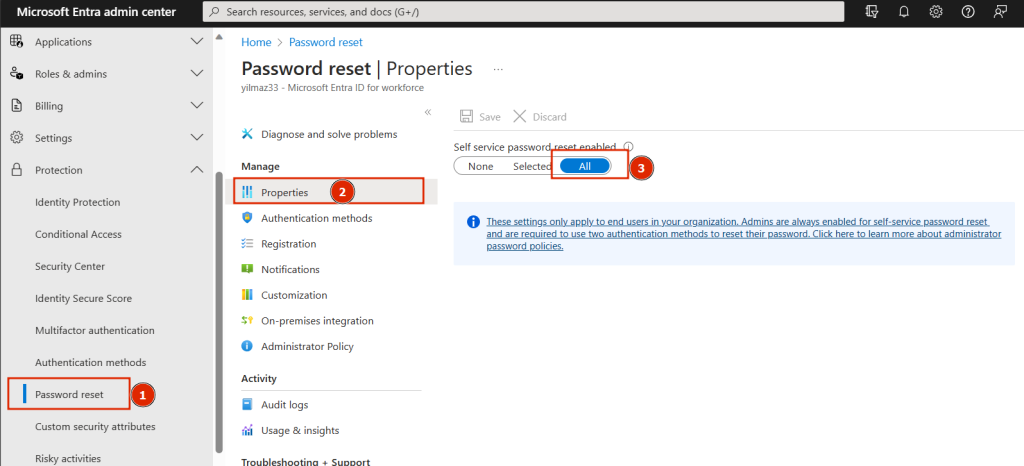Entra ID portal içerisin de Sol menü de Protection Sekmesi altında bulunan Password reset bölümüne geliyoruz.