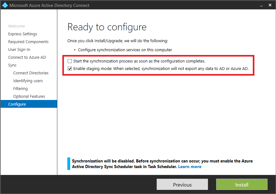 Ready to Configure adımın da “Enable staging mode: When selected, synchronization will not export any data to AD to Azure AD” seçeneği ile Staging Mode aktif hale getirebiliriz.