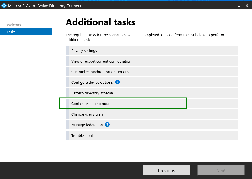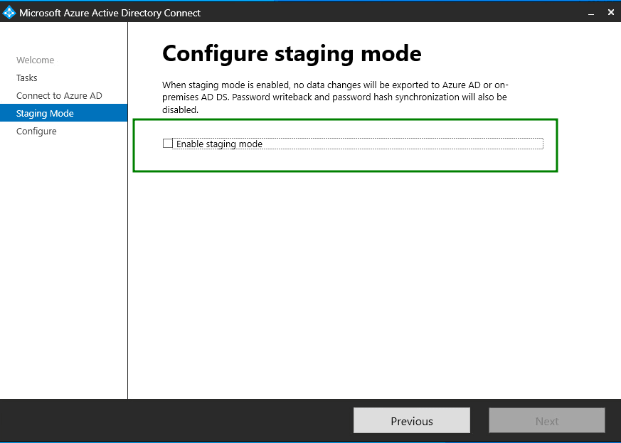 Azure AD Connect uygulamasından “Configure staging mode” adımına geliyoruz