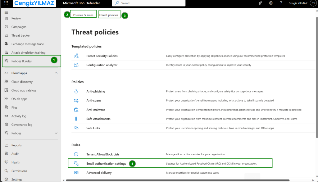 https://security.microsoft.com/ - Policies & Rules - Threat Policies - Email authentication settings adımlarını takip ediyoruz.