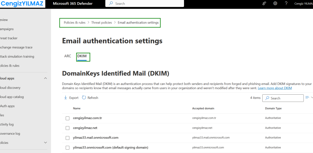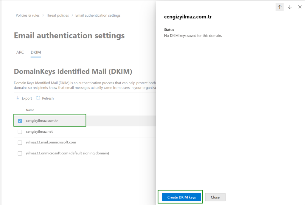Email Authentication bölümün de DKIM sayfasına geliyoruz ve Tenant içerisin de kayıtlı olan tüm domainlerimizi görüntüleyebiliyoruz.
