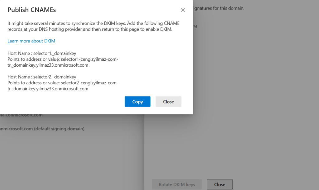 | Microsoft.Exchange.Management.Tasks.ValidationException | CNAME record does not exist for this config. Please publish the following two CNAME records first. Domain Name : cengizyilmaz.com.tr Host Name : selector1._domainkey Points to address or value: selector1-cengizyilmaz-com-tr._domainkey.yilmaz33.onmicrosoft.com Host Name : selector2._domainkey Points to address or value: selector2-cengizyilmaz-com-tr._domainkey.yilmaz33.onmicrosoft.com . If you have already published the CNAME records, sync will take a few minutes to as many as 4 days based on your specific DNS. Return and retry this step later. |