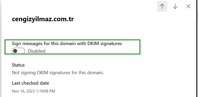 Sign messages for this domain with DKIM signatures bölümünü Enabled duruma getirerek DKIM Validation adımını tamamlamış oluyoruz.
