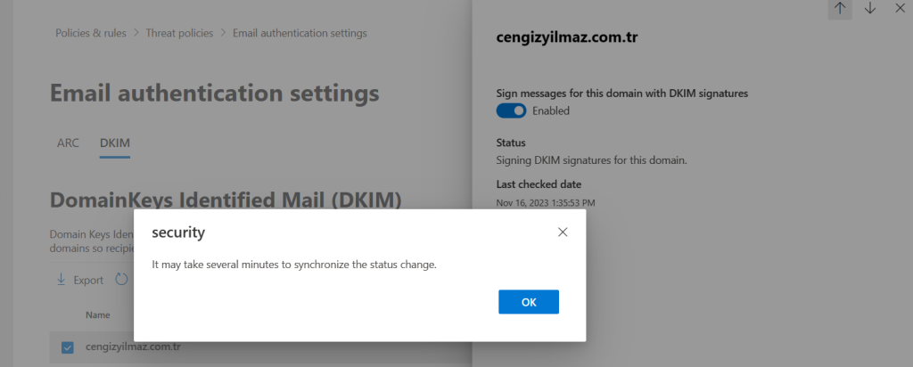 Etkinleştirme işleminı gerçekleştirdik, göndermiş olduğum her mail için DKIM anahtarı ekleyebileceğiz.