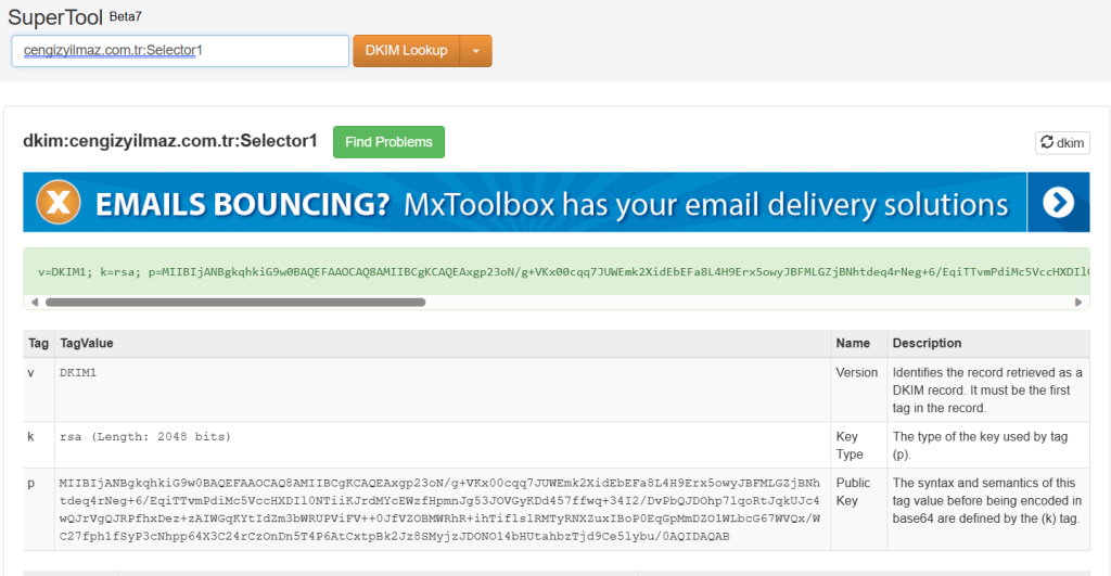 Exchange Online için yayınlamış olduğumuz DKIM kaydını mxtoolbox.com ile sorgulayabiliriz.