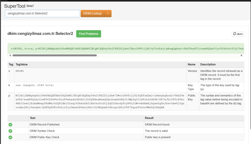 ilk sorgulama işlemimiz Exchange Online’ın verdiği selector1 anahtarı için gerçekleştiriyorum ve 2048 bits anahtarımızın doğruluğunu görüntüleyebiliyorum.