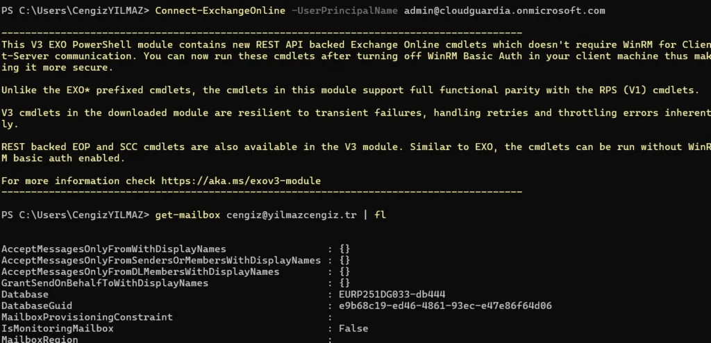 Exchange Online PowerShell bağlantısı sağlama işlemi tamamlandı, şimdi test için bir kontrol işlemi sağlayabiliriz.