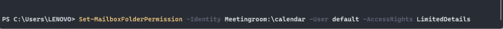 Exchange Online’da toplantı odaları için konuyu ve düzenleyici takvim de göstermek için Limited Details (Sınırlı Erişim) hakkı vermemiz gerekmektedir. Bu işlem için aşağıdaki Set-MailboxFolderPermission komutu ile işlem yapmamız gerekmektedir.