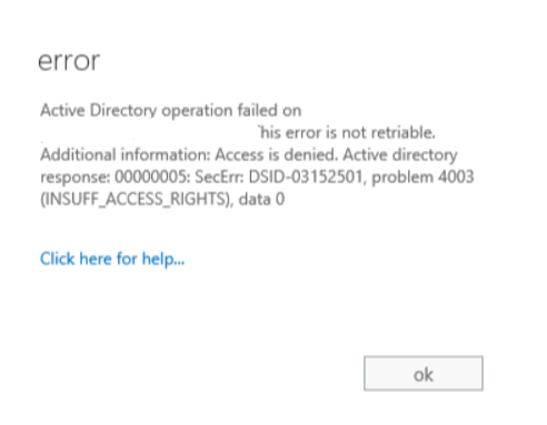 “Access is denied. Active directory response: 00000005: SecErr: DSID-03152501, problem 4003 (INSUFF_ACCESS_RIGHTS), data 0”
