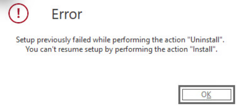 Setup previously failed while performing the action "Uninstall". You can't resume setup by performing the action