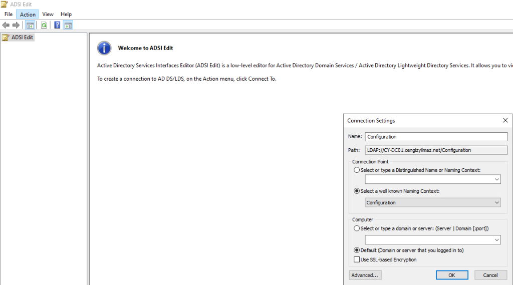 Run üzerinden “ADSIEdit.msc” çalıştırarak başlayın.