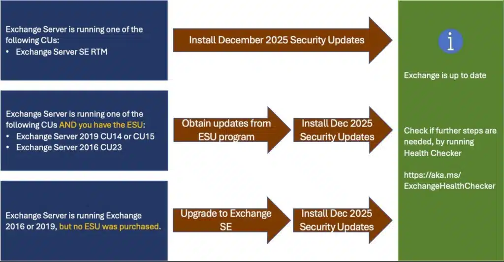 Extended Security Update (ESU) programına kayıt olmuş müşteriler, Exchange Server 2016 ve 2019 için Aralık 2025 (ve sonrasında yayınlanacak) güvenlik güncellemelerini almaya hak kazanır.