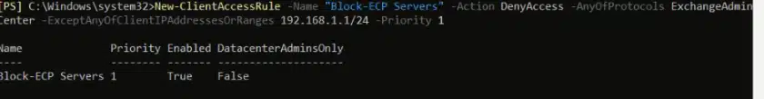 New-ClientAccessRule -Name “Block-ECP Servers” -Action DenyAccess -AnyOfProtocols ExchangeAdminCenter -ExceptAnyOfClientIPAddressesOrRanges 192.168.1.1/24 -Priority 1