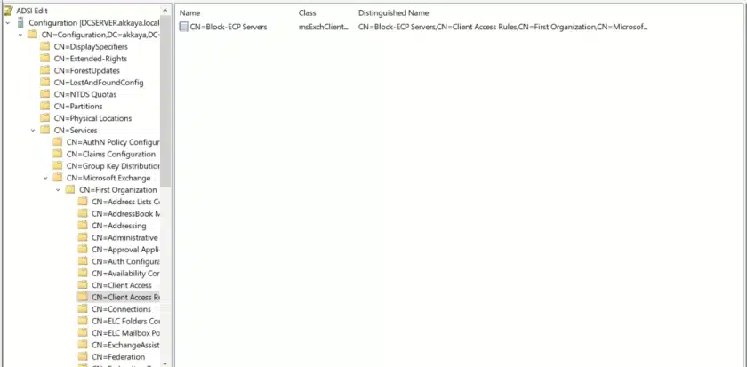 Exchange Server yapılandırmalarında olduğu gibi, Client Access Rules (CAR) da Active Directory‘nin bir parçası olarakADSI (Active Directory Service Interfaces) yapısında saklanmaktadır. Bu kurallar, özellikle Active Directory’nin “Client Access Rules” adlı nesnesi altında depolanır.