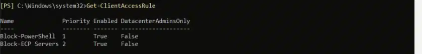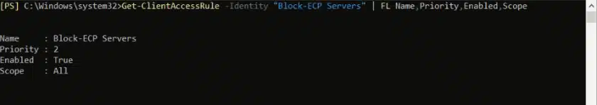 Get-ClientAccessRule -Identity "Block-ECP Servers" | FL Name,Priority,Enabled,Scope
