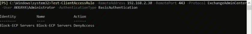 Bu test işlemi, IP adresi 192.168.2.30 olan bir cihazdan, ECP’ye (Exchange Admin Center) 443 portu üzerinden BasicAuthentication yöntemi kullanılarak yapılan bir erişim denemesini simüle eder. Administrator kullanıcısı için bu erişimin mümkün olup olmadığını test eder. Test sonucu, belirlediğimiz kuralın beklenen şekilde çalışıp çalışmadığını göstermektedir.