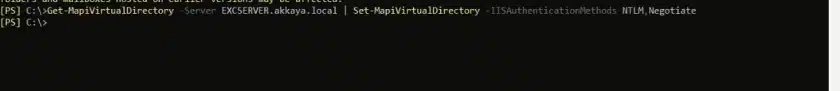 Get-MapiVirtualDirectory -Server EXCSERVER | Set-MapiVirtualDirectory -IISAuthenticationMethods Ntlm, Negotiate