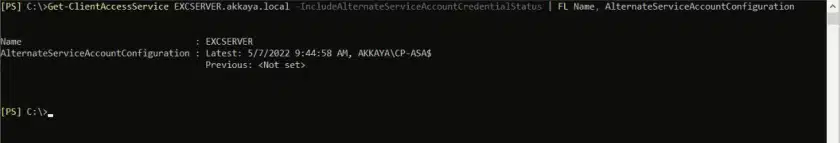 Get-ClientAccessService EXCSERVER -IncludeAlternateServiceAccountCredentialStatus | fl Name, AlternateServiceAccountConfiguration
