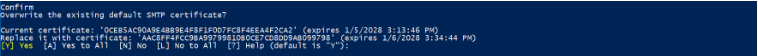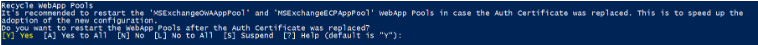 Komut ilk çalıştığında “Y” olarak yanıt verilirse, script katılımsız olarak çalışmaya başlar. Etkin Kimlik Doğrulama Sertifikası değiştirildiğinde WebApp havuzlarının yeniden başlatılması önerilir. Local SMTP sertifikasının yeni oluşturulan Kimlik Doğrulama Sertifikası ile değiştirilmesi önerilmez.