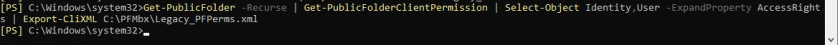 Get-PublicFolder -Recurse | Get-PublicFolderClientPermission | Select-Object Identity,User -ExpandProperty AccessRights | Export-CliXML C:PFMbxLegacy_PFPerms.xml