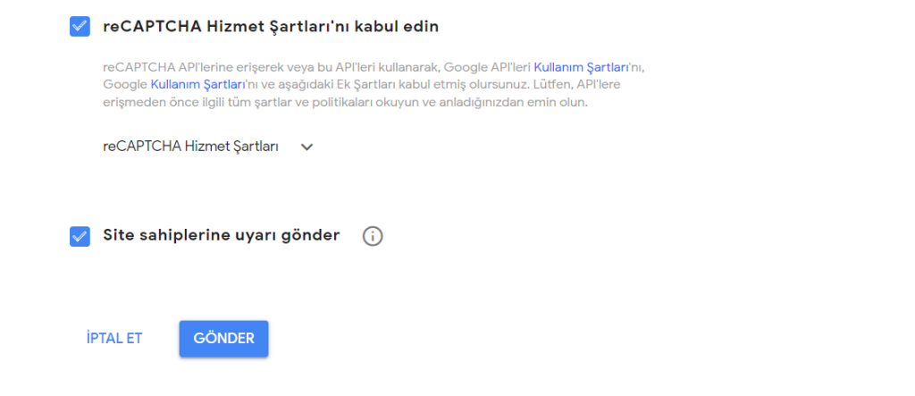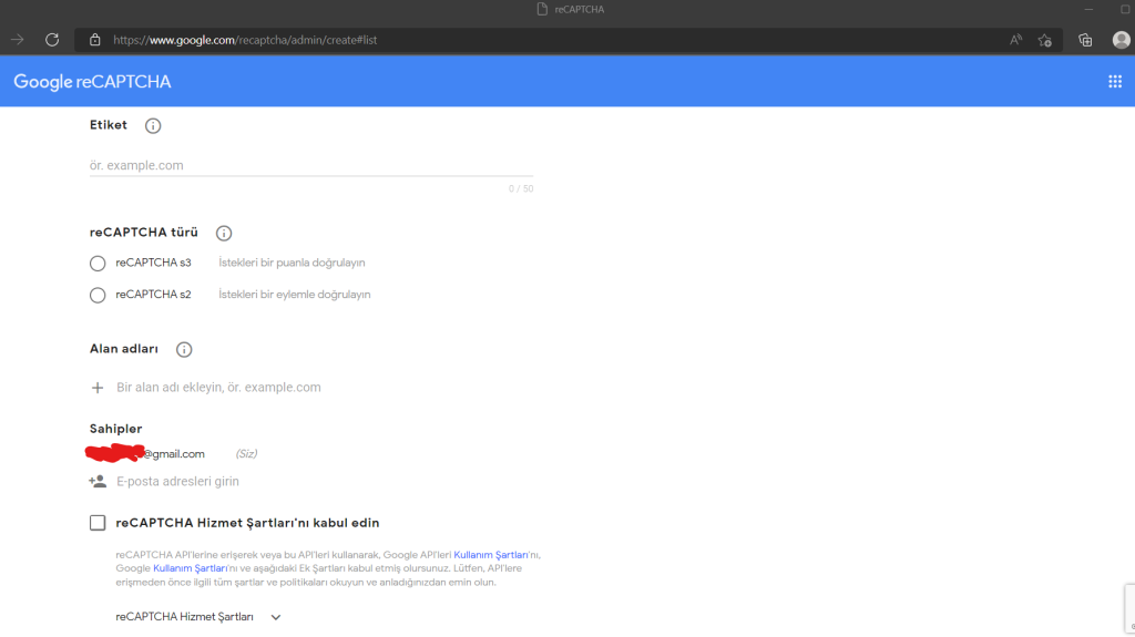 reCAPTCHA türü belirlemeniz gerekiyor, ben bu projede reCAPTCHA s2 - Ben Robot Değilim işlemini seçtim.