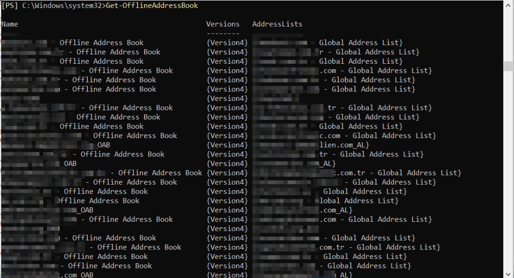 Get-OfflineAddressBook komutu, sistemdeki tüm OAB'leri ve onların detaylarını gösterir.